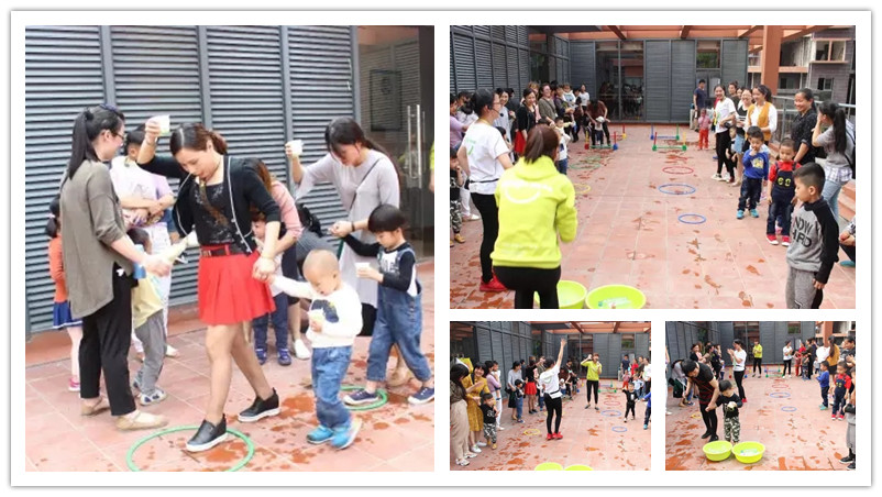 家长和孩子默契地进行着游戏,亲子关系十分好,并努力地不让杯子中的水溢出来,培养他们节约用水的好习惯。
